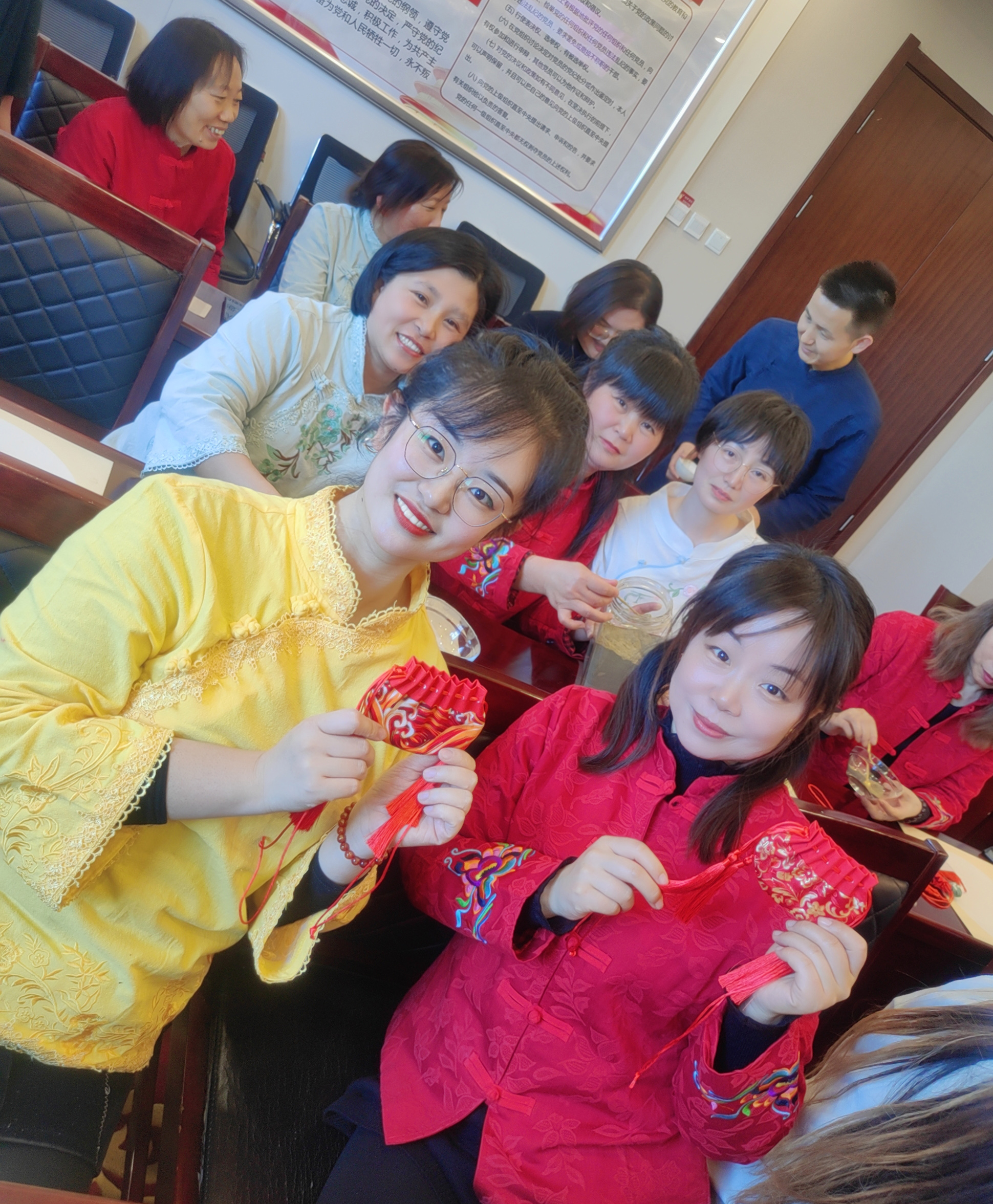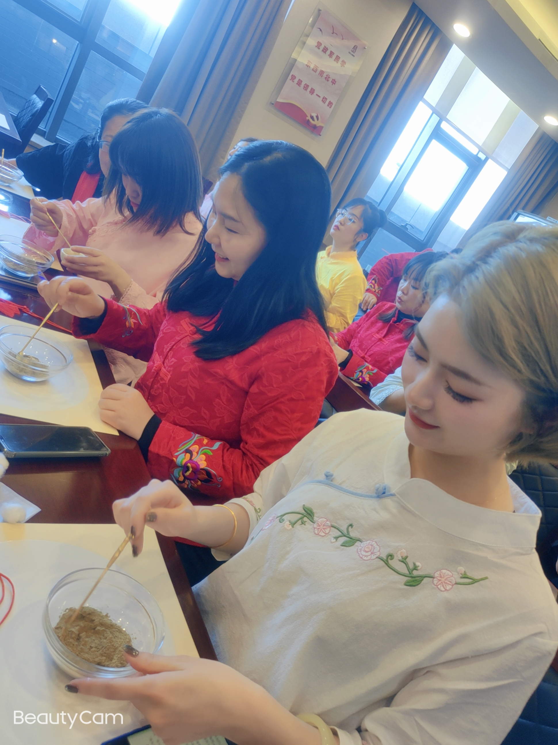 制作过程中,大家互相学习、相互交流,兴致盎然、十分投入。在阵阵欢笑声中,一个个香囊在大家忙碌的氛围中生产出来,看着一件件劳动果实,大家开心之情溢于言表。